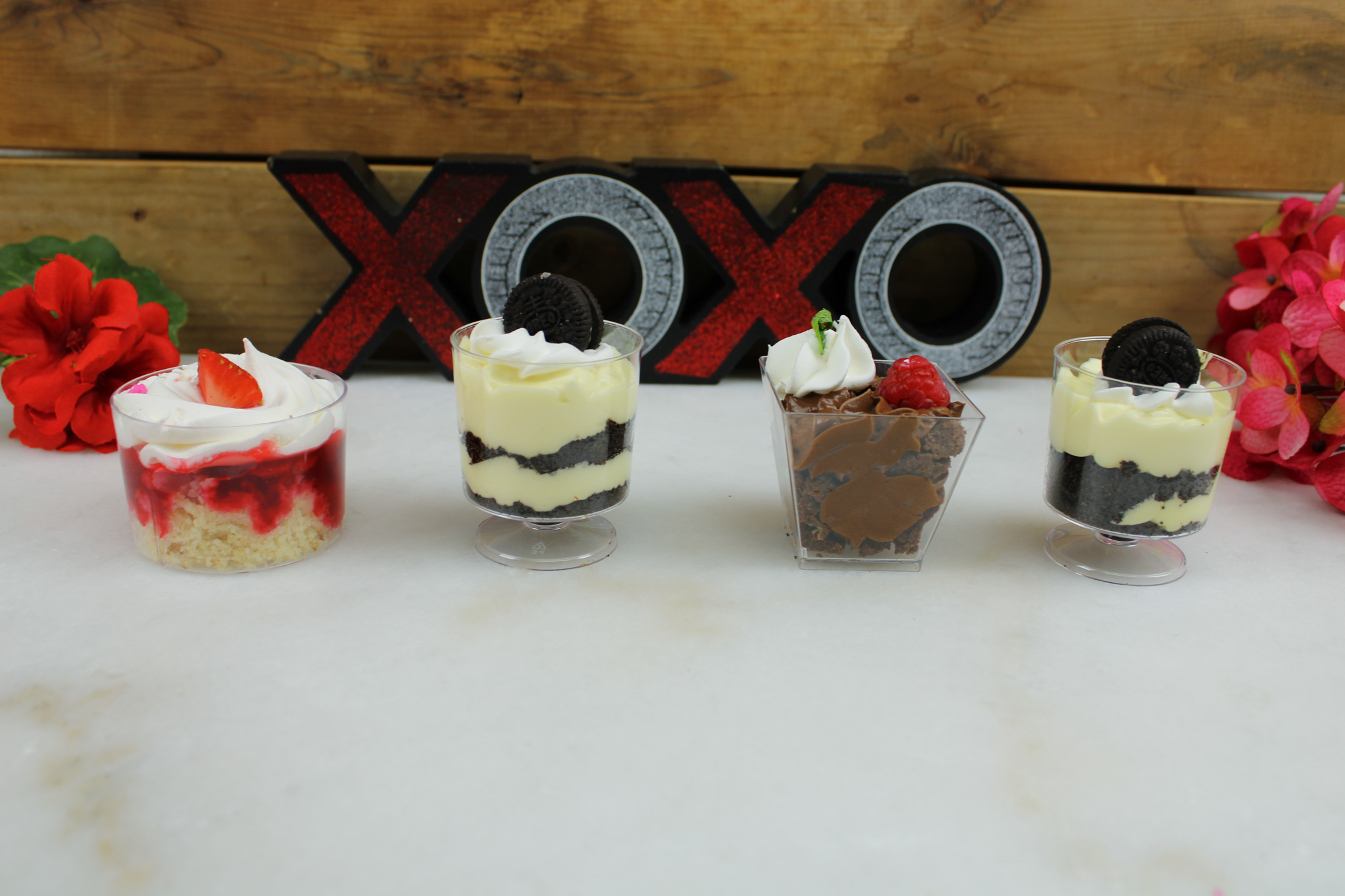 An assortment of our hand-made Gourmet Dessert Shots presented in a variety of clear shot containers.