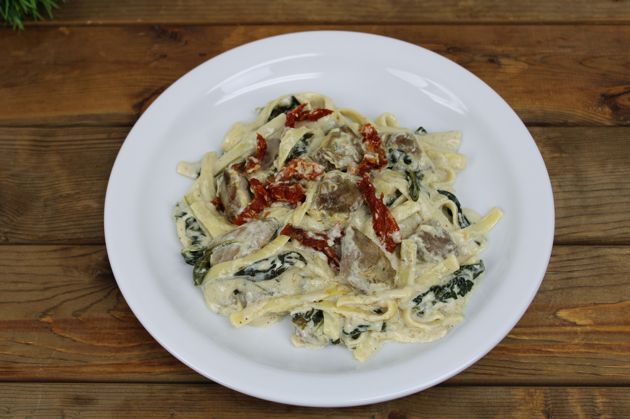 Sirloin steak medallions with fettuccine Alfredo, Gorgonzola cheese, fresh spinach and sun-dried tomatoes Served with choice of salad, choice of vegetable, garlic bread, Parmesan cheese & crushed red pepper